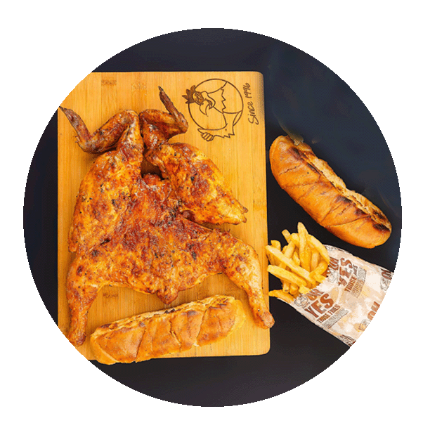 Enjoy the Chicken Hut Family Combo comes with two fresh garlic rolls, crispy jumbo fries and our succulent grilled chicken basted in our secret Portuguese sauce and two drinks